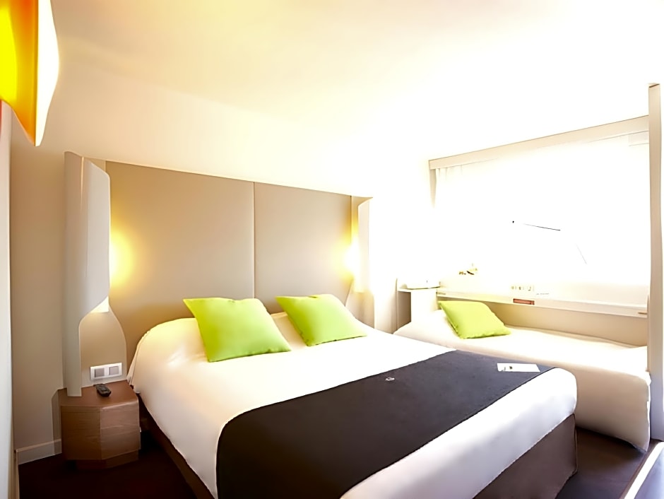 These rooms have a TV and an private bathroom. They are decorated in neutral colors with green and brown tones.