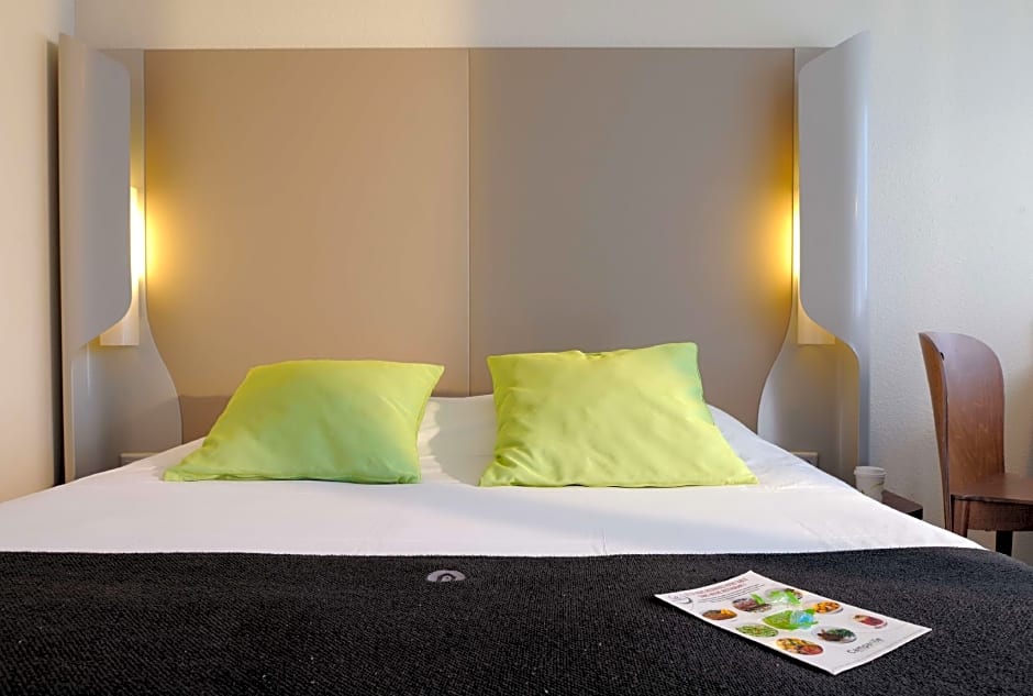 These rooms have a TV and an private bathroom. They are decorated in neutral colors with green and brown tones.